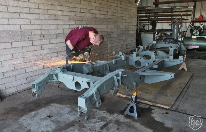 So far, Dahn has removed the body, the engine and transmission, tore down all small pieces, media blasted all metal chassis, including body and doors and all small trim to expose rust-damaged areas that were found on the chassis following blasting. They prepped the chassis with a rust-removing acid to neutralize any remaining rust and primed it with metal-etching primer to stop any new rust.