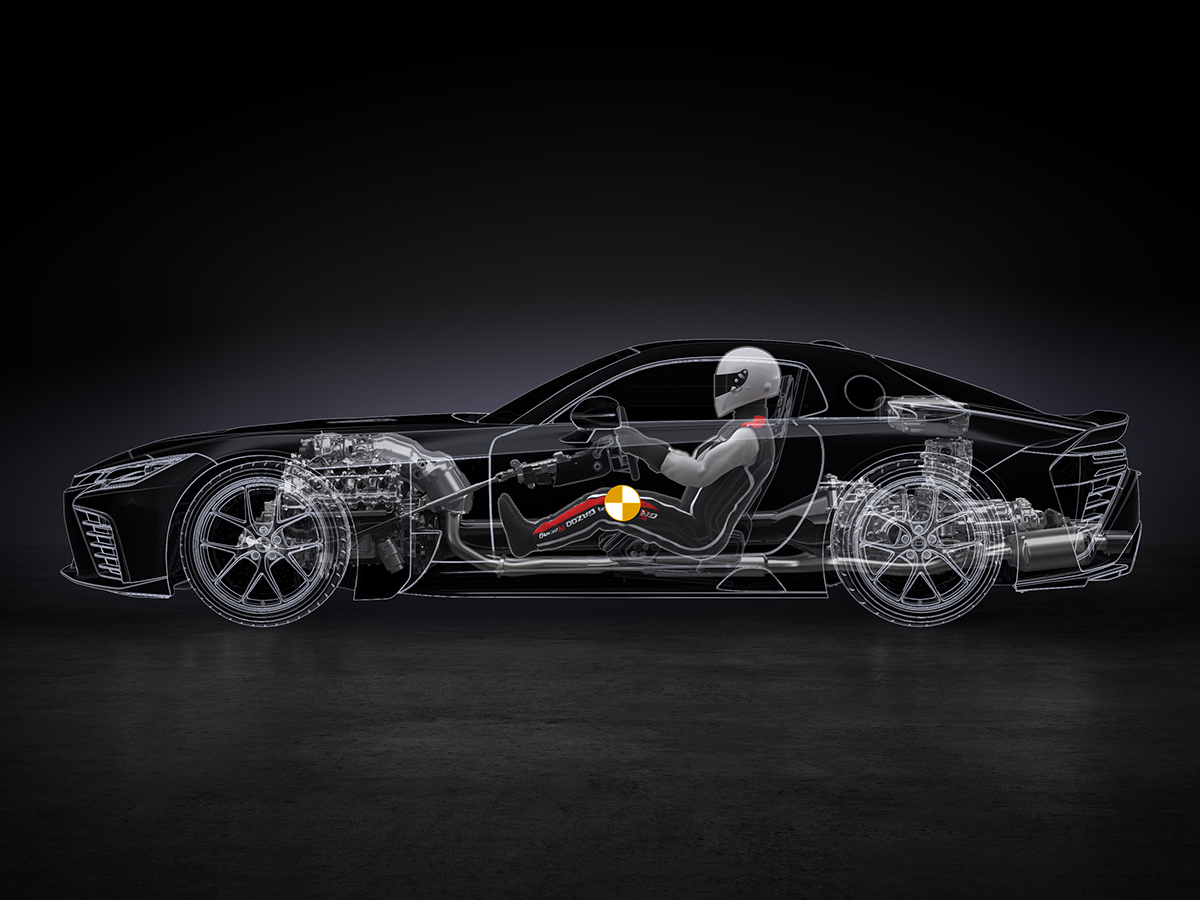 Development of the GR GT, which is continuing, started with an aim to achieve a thoroughly low center of gravity by considering how to lower both overall vehicle height and the driver’s position as much as possible. Attention was then paid to adopting a front-engine, rear-wheel-drive powertrain layout for ease of handling when driving the vehicle to its limit. The center of gravity of heavy components, such as the 4-liter, V8 twin-turbo engine with dry-sump lubrication, rear-mounted transaxle, and other major mechanisms, has been significantly lowered through optimized positioning. Both the driver’s and car’s centers of gravity have been made roughly identical by pursuing an ideal driving position aimed at enhancing the sense of car-driver unity and handling ease.