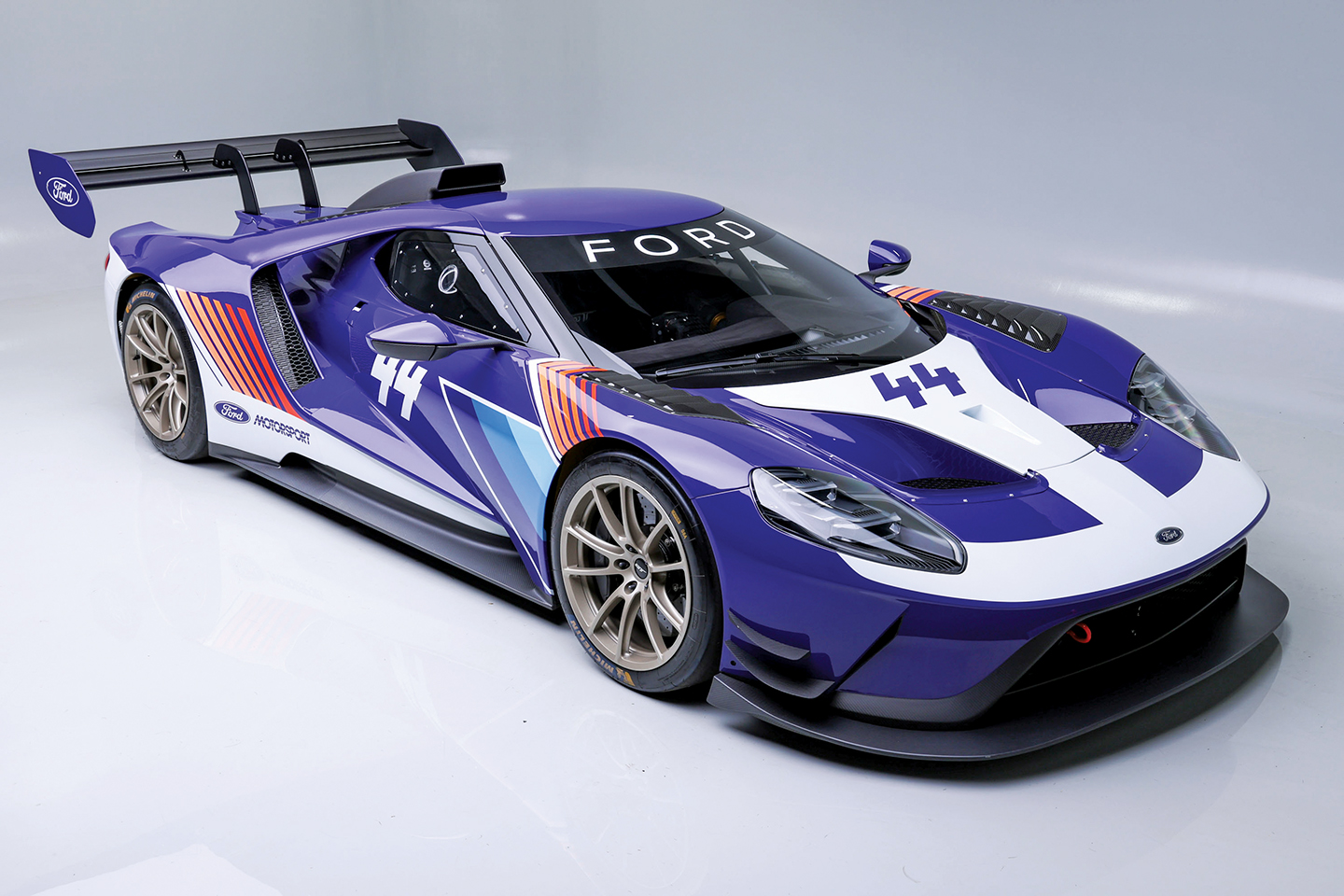 Heightened performance is courtesy of the stripped-down carbon-fiber body and FIA-compliant aerodynamic upgrades, with race-derived stopping via Brembo carbon-ceramic brakes all around. The purposeful, competition-style Mk II interior includes a Sparco racing seat, FIA-approved safety harness, a simplified dash and MoTeC data acquisition/digital display, butterfly-style steering wheel, a roll cage, fire suppression system and minimal soundproofing. Race-spec lightweight paint finishes this Mk II, plus striking multi-color graphics, Ford and Ford Performance insignias and “44” racing numbers. At the time of writing, just 41 actual miles have been accumulated from new.