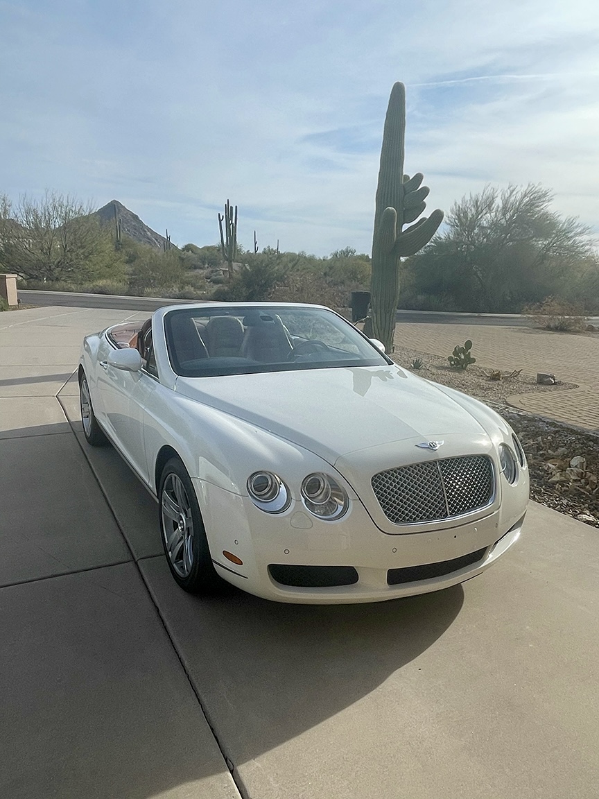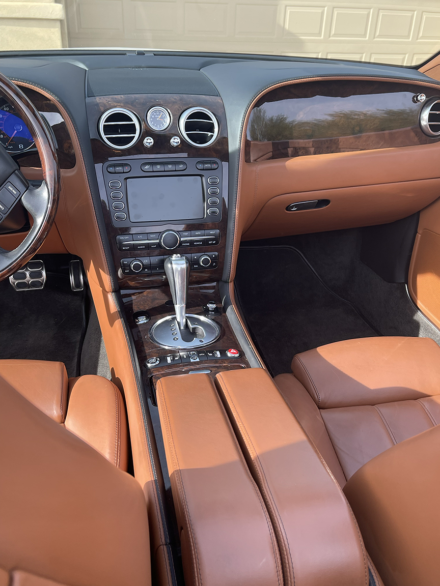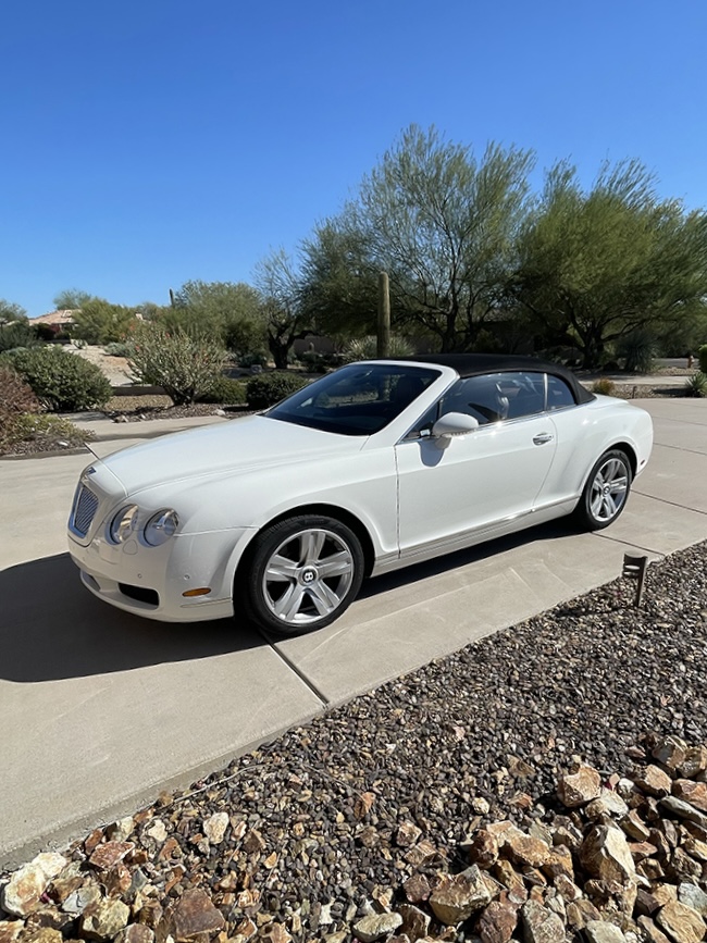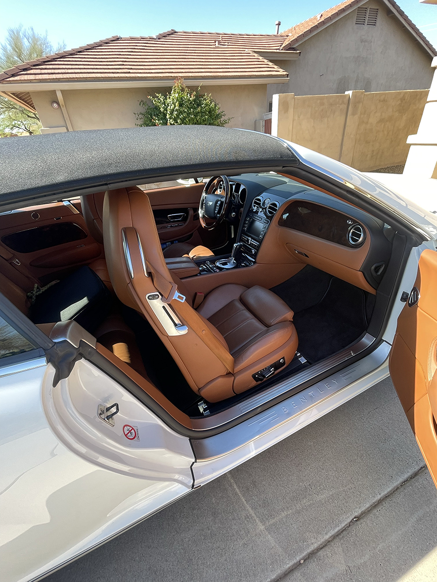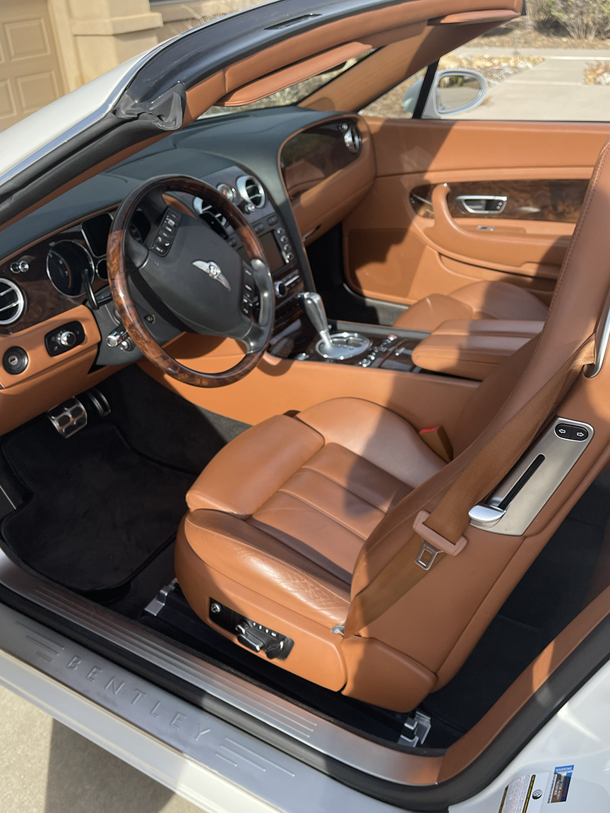 FOR SALE – 2008 Bentley Continental GTC AWD, White over Brown Extended Leather Upholstery, Burlwood interior trim, ZF 6 Speed Automatic, 50,700 miles, front-dual AC, automatic temperature control, power convertible roof, navigation system, twin stainless steel tail pipes, 4-spoke wood & hide steering wheel, heated seats, Satellite radio, many other features!
