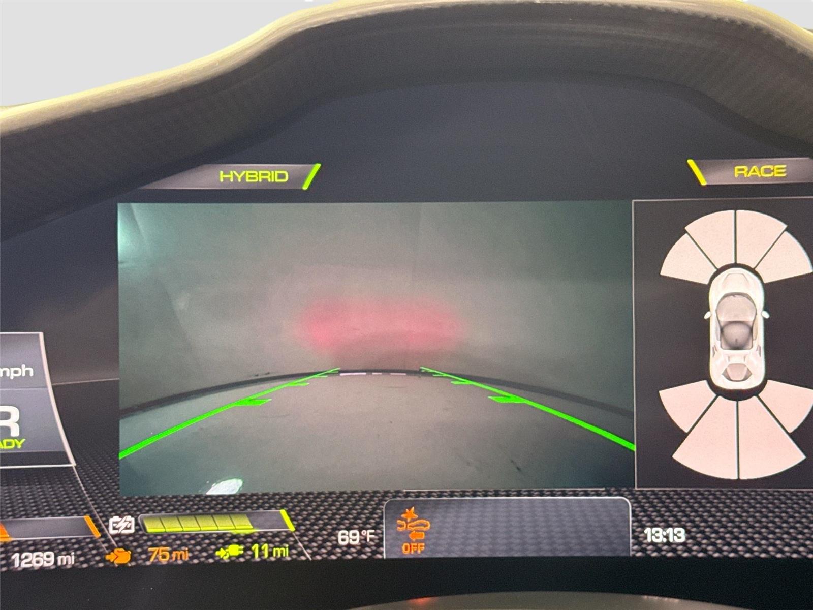 - The vehicle is equipped with a camera that displays an image of the area behind the vehicle on an interior display.