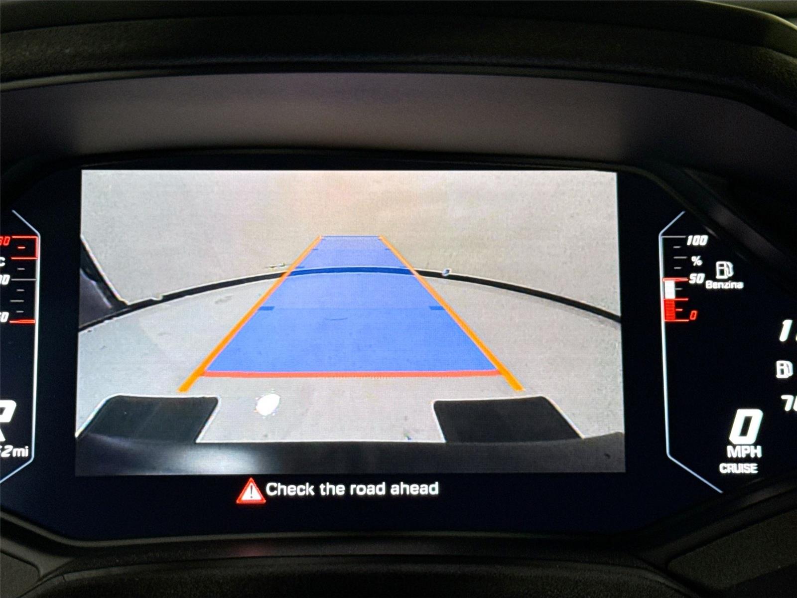 - The vehicle is equipped with a camera that displays an image of the area behind the vehicle on an interior display.