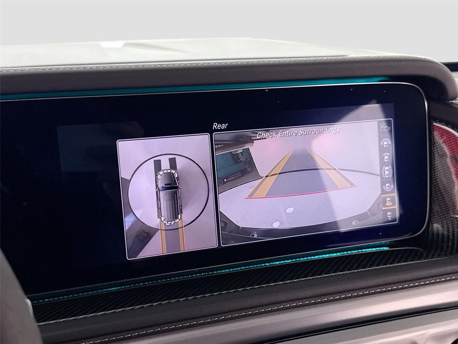 - The vehicle is equipped with a camera that displays an image of the area behind the vehicle on an interior display.