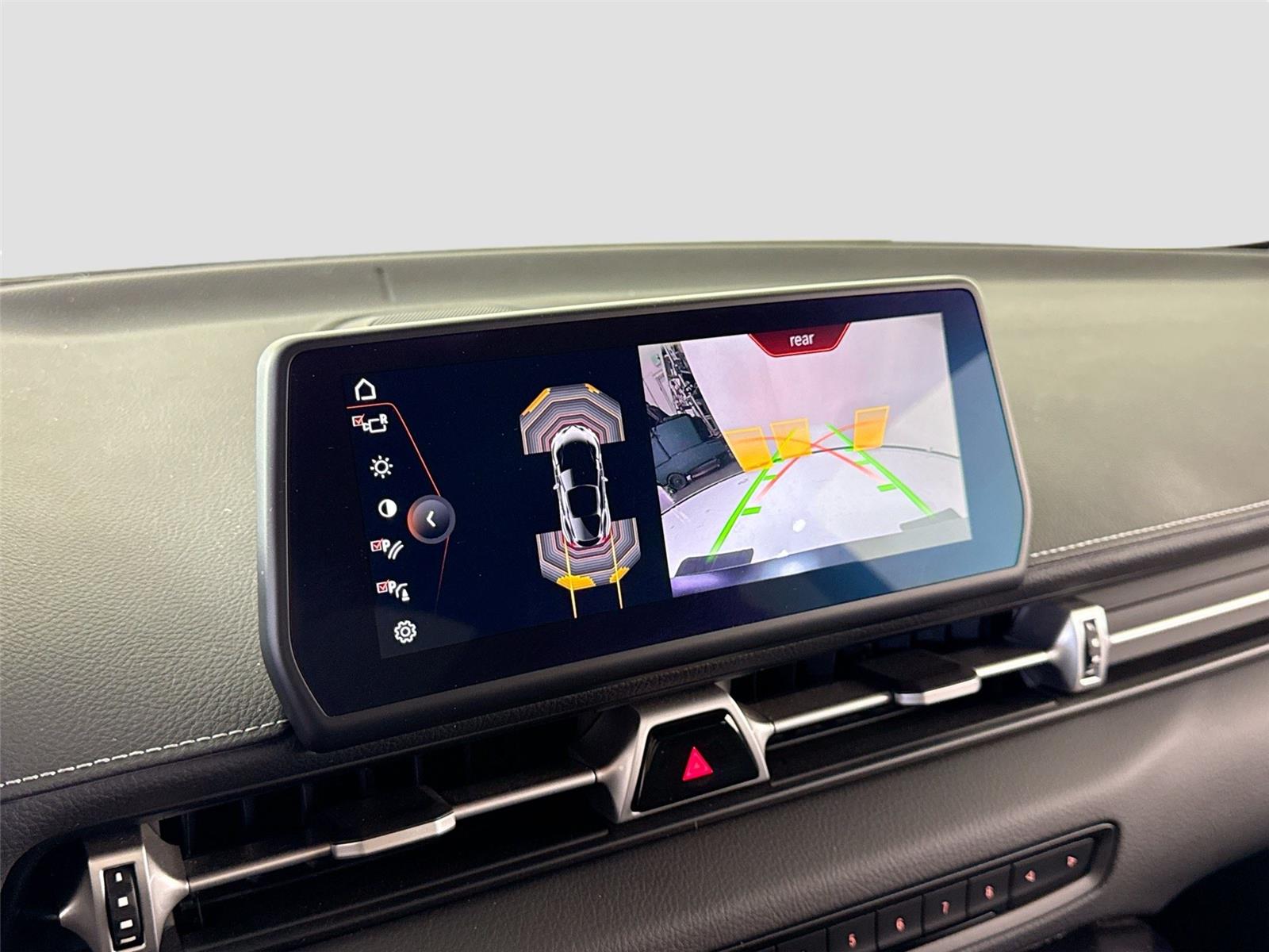 - The vehicle is equipped with a camera that displays an image of the area behind the vehicle on an interior display.