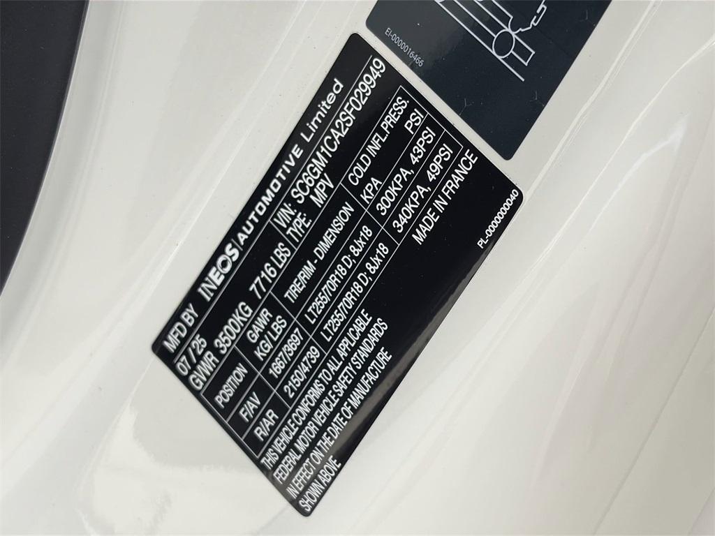 This NEW 2025 White INEOS Grenadier 3.0L I6 8-Speed Automatic 4WD is well equipped and includes these features and benefits:4-Wheel Disc Brakes, ABS brakes, Air Conditioning, AM/FM radio, Anti-whiplash front head restraints, Auto High-beam Headlights, Automatic temperature control, Bodyside moldings, Bumpers: body-color, Driver door bin, Dual front impact airbags, Dual front side impact airbags, Electronic Stability Control, Exterior Parking Camera Rear, Front anti-roll bar, Front Bucket Seats, Front Center Armrest, Front reading lights, Heated door mirrors, Illuminated entry, Knee airbag, Leather Seat Trim, Leather steering wheel, Low tire pressure warning, Navigation System, Occupant sensing airbag, Outside temperature display, Overhead airbag, Overhead console, Panic alarm, Passenger door bin, Power door mirrors, Power steering, Power windows, Radio: Central Control System w/Navigation, Rear anti-roll bar, Rear fog lights, Rear window defroster, Rear window wiper, Remote keyless entry, Security system, Speed control, Speed-sensing steering, Split folding rear seat, Steering wheel mounted audio controls, Tachometer, Telescoping steering wheel, Tilt steering wheel, Traction control, Trip computer, Variably intermittent wipers.Looking for a rugged 4X4 built for real work and real adventure? Our sales team knows the INEOS Grenadier inside and out. We’ll walk you through its uncompromising capability and ensure you find the right model for your off-road ambitions.